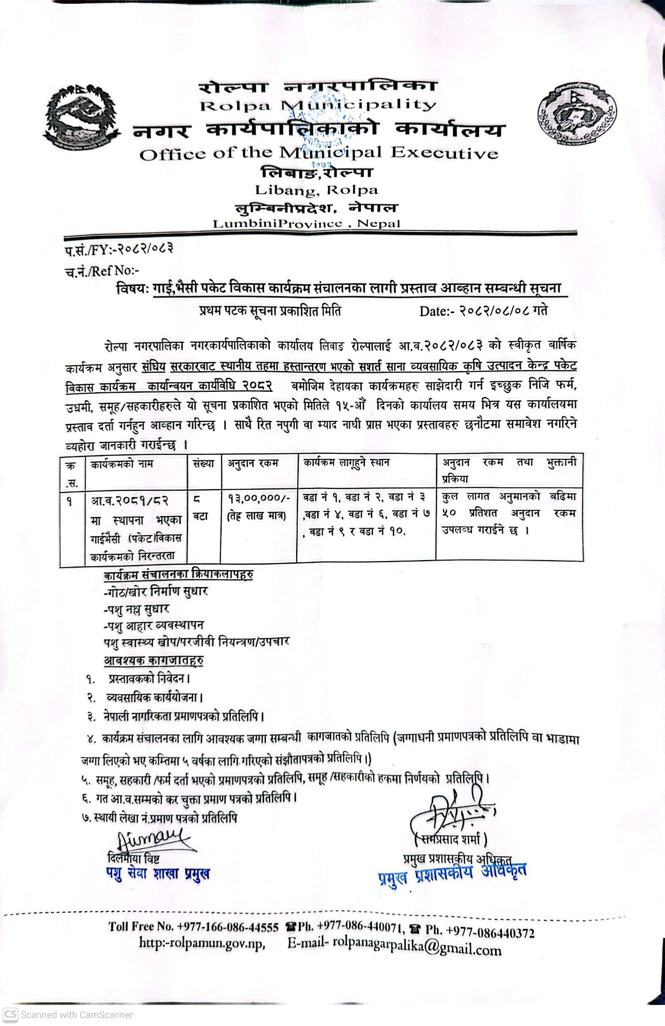 गाई, भैसी पकेट विकास कार्यक्रम संचालनका लागी प्रस्ताव आब्हान सम्बन्धी सूचना ।